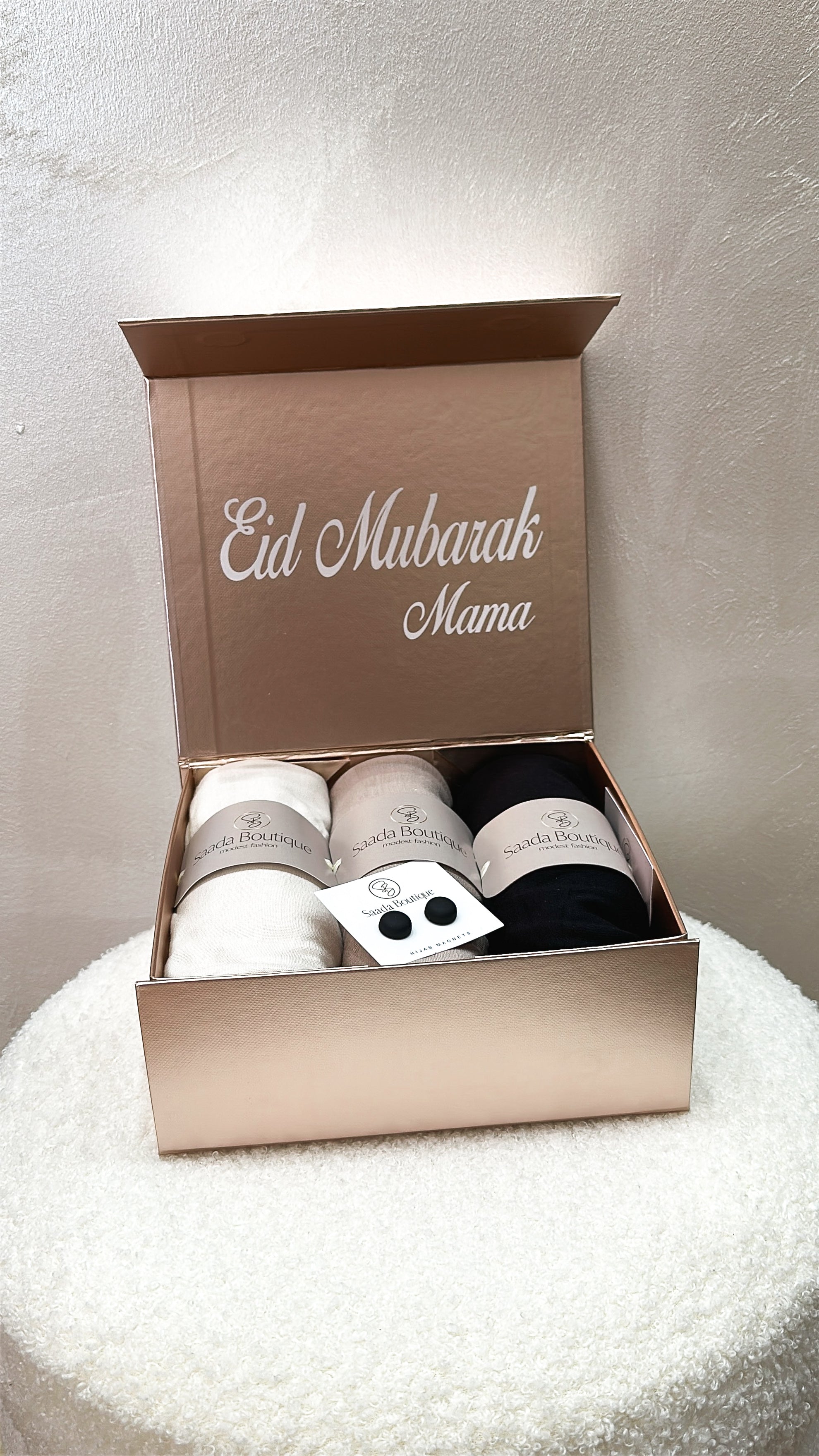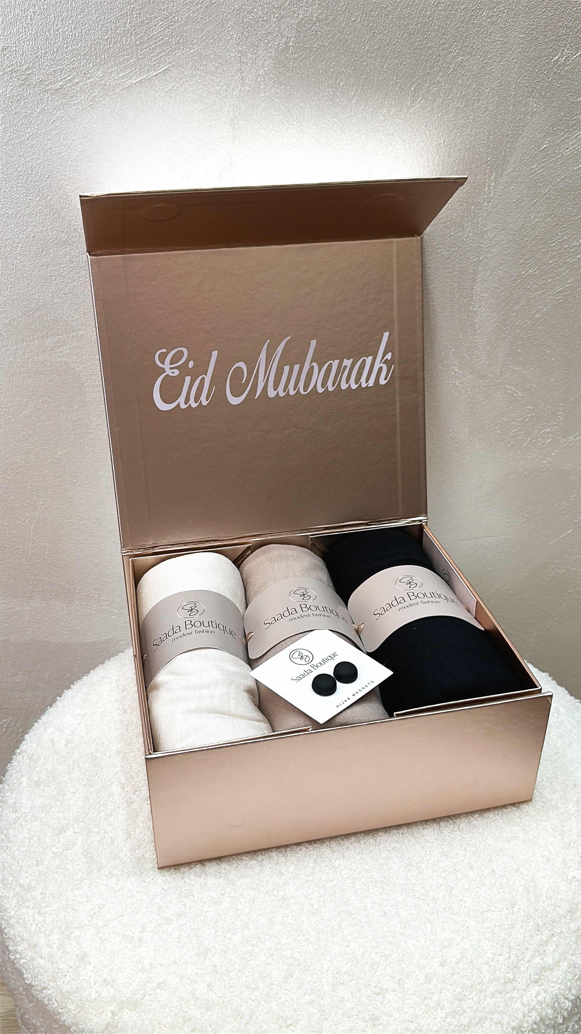 The box is filled with 3 viscose scarves and two hijab magnets in matte black.