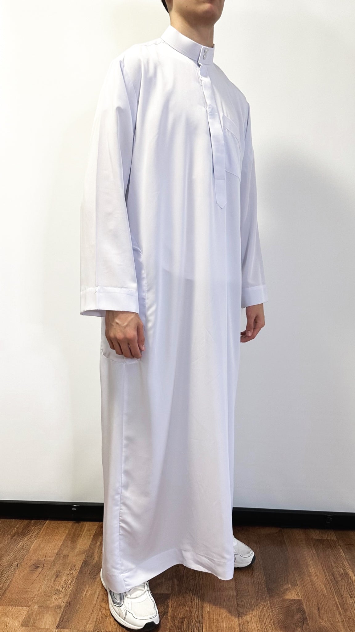 A traditional Thoub (or Qamis) with buttons at the chest and snap buttons at the collar. The fabric is made of soft satin (and smooth).