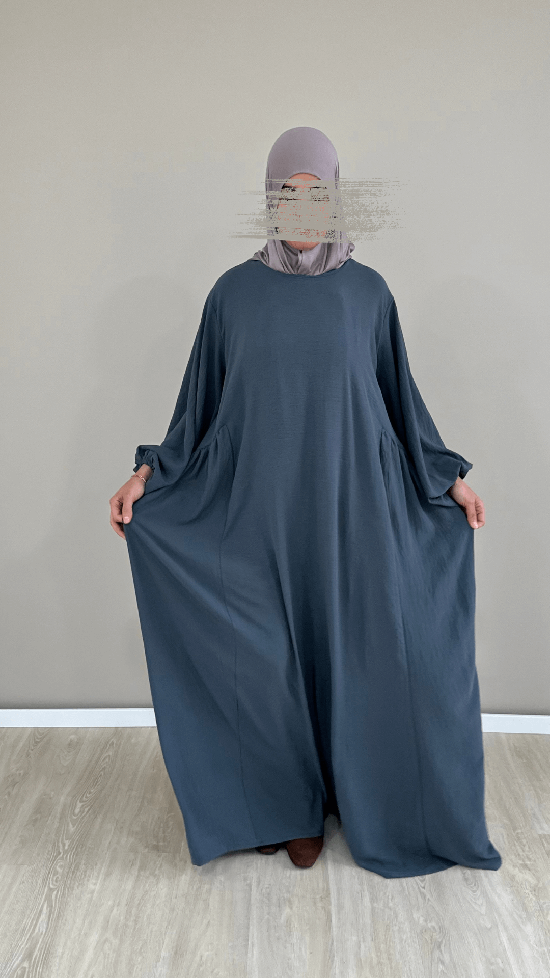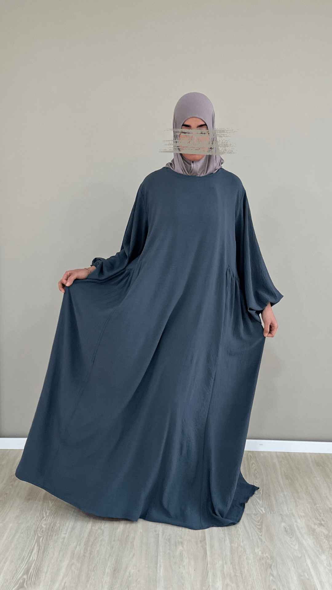 The model in the pictures is 1.71 m tall (size L) and wears the Amira abaya in the length 1.60 m.