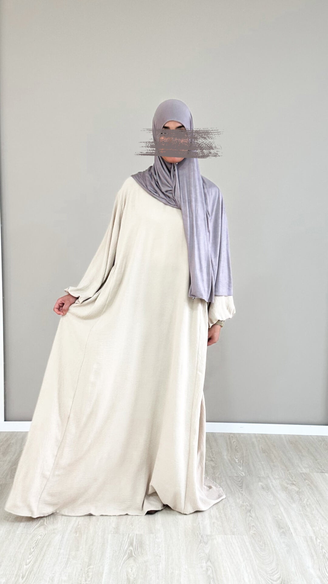 The model in the pictures is 1.71 m tall (size L) and wears the Amira abaya in the length 1.60 m.