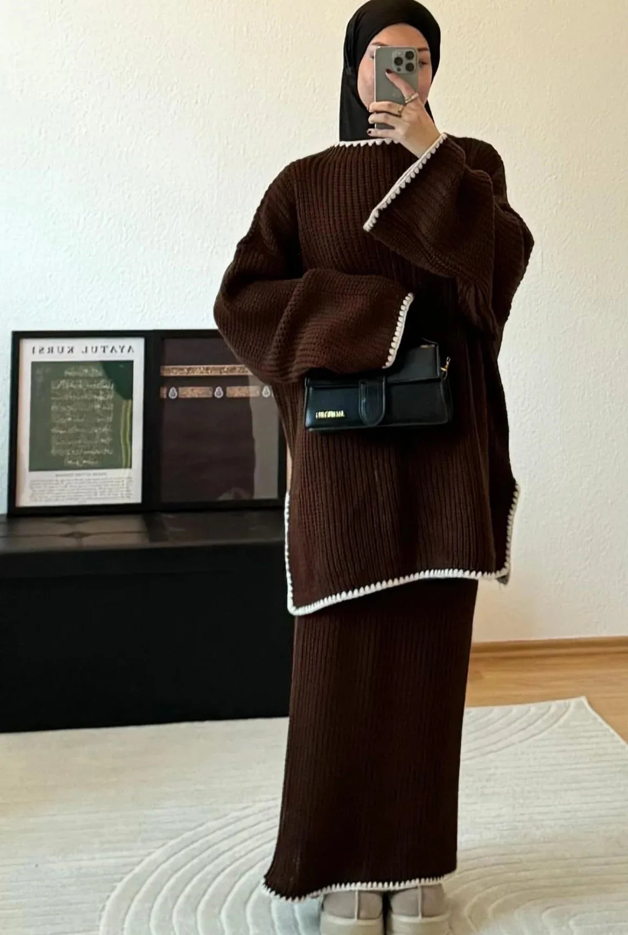 This knitted two-piece will accompany you through the cold season from now on. The set is super cozy and can be very elegantly combined with boots or sportily with comfortable sneakers. Material: 100 % Acrylic Dimensions: Skirt length: approx. 100 cm; Top length: approx. 80 cm; Bust circumference top: approx. 140 cm The model is 1.70 m tall