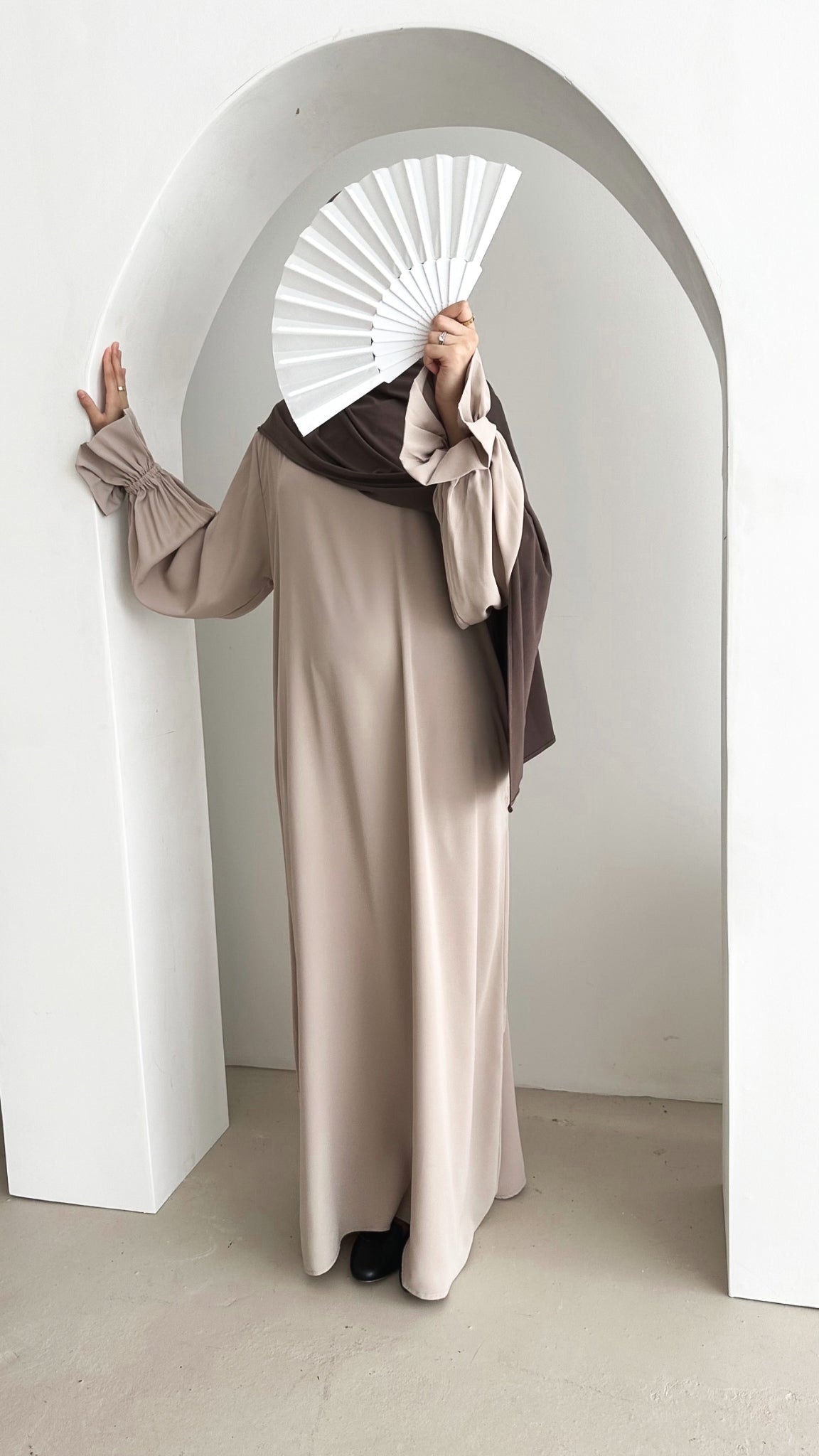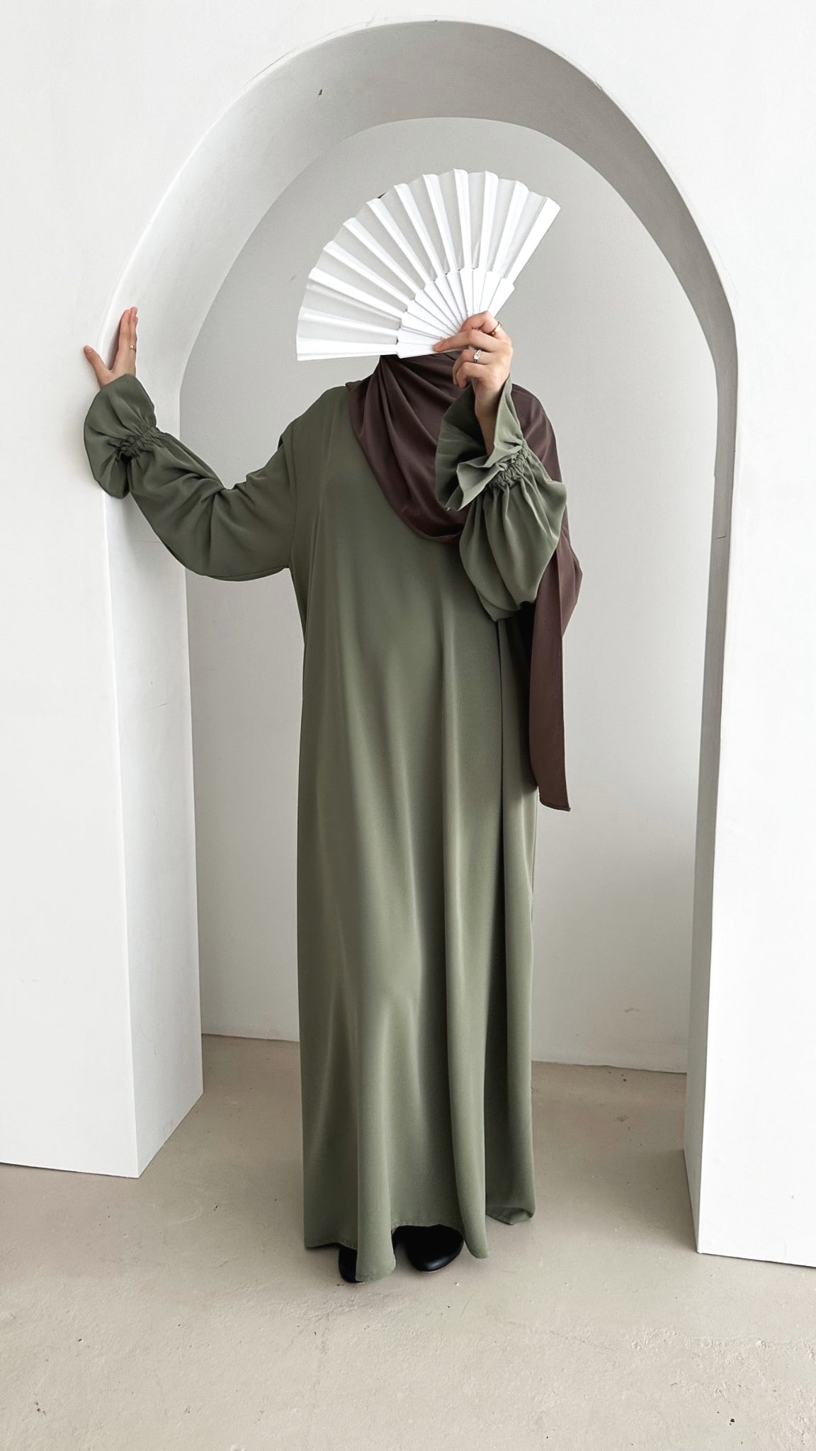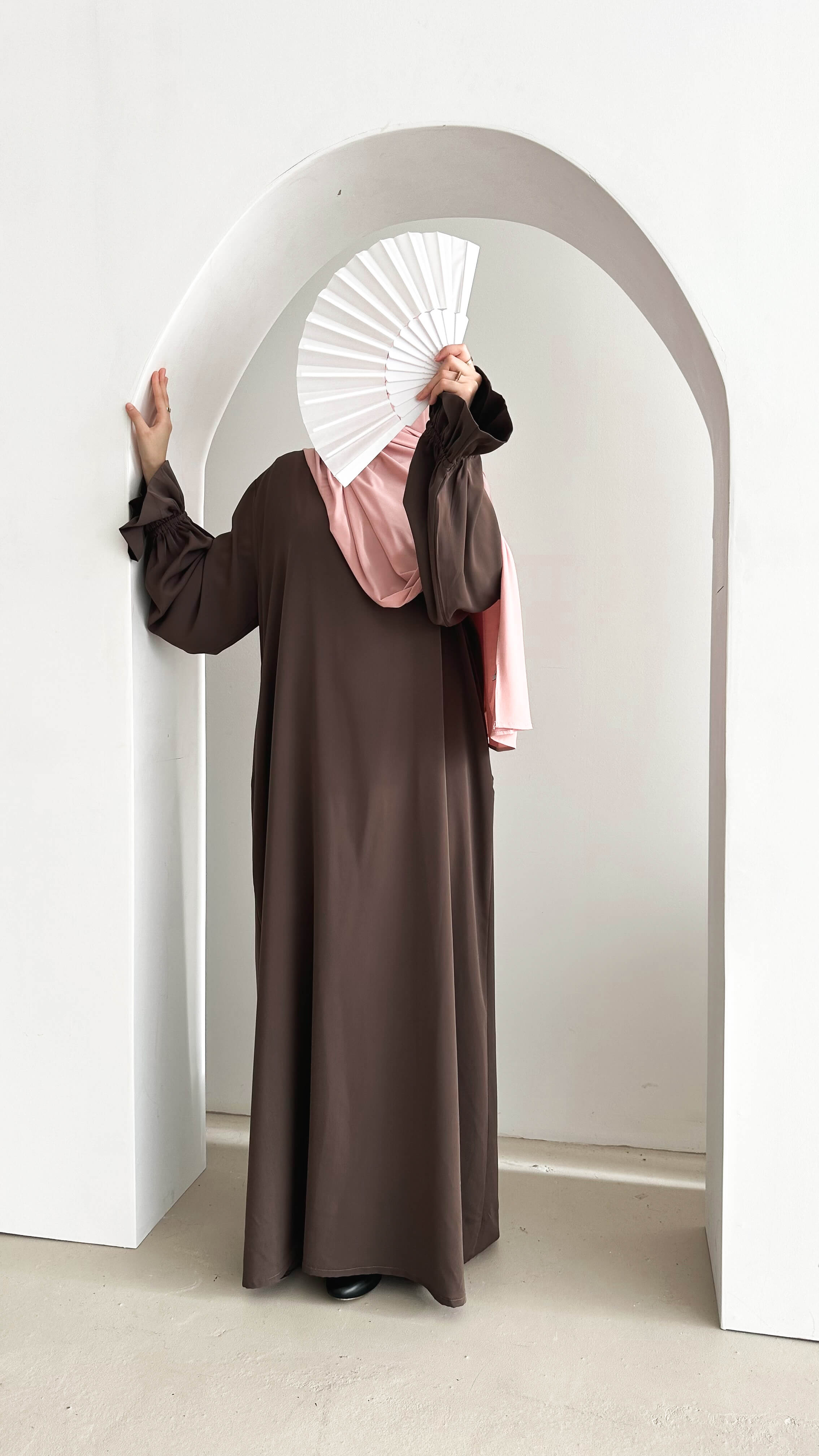 The abaya has an A shape, is subtly oversized, and features two practical side pockets.