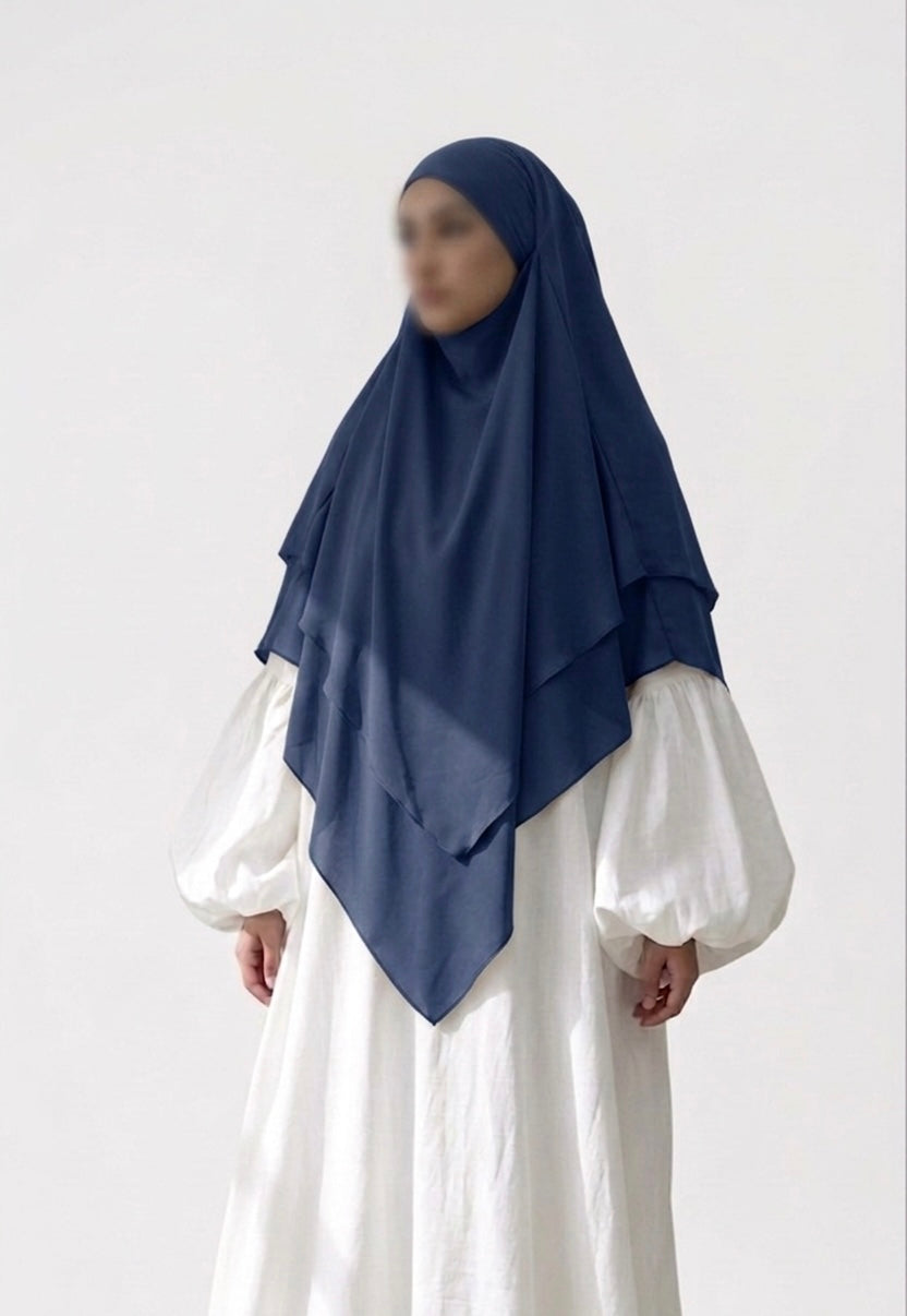 Unser dreilagiger Chiffon Khimar überzeugt durch seinen fließenden Fall und ein besonders leichtes, angenehmes Tragegefühl.